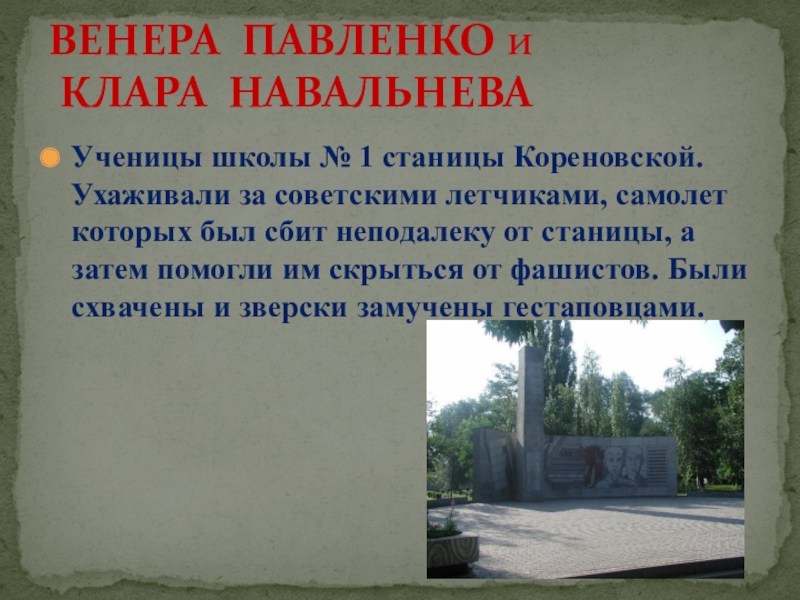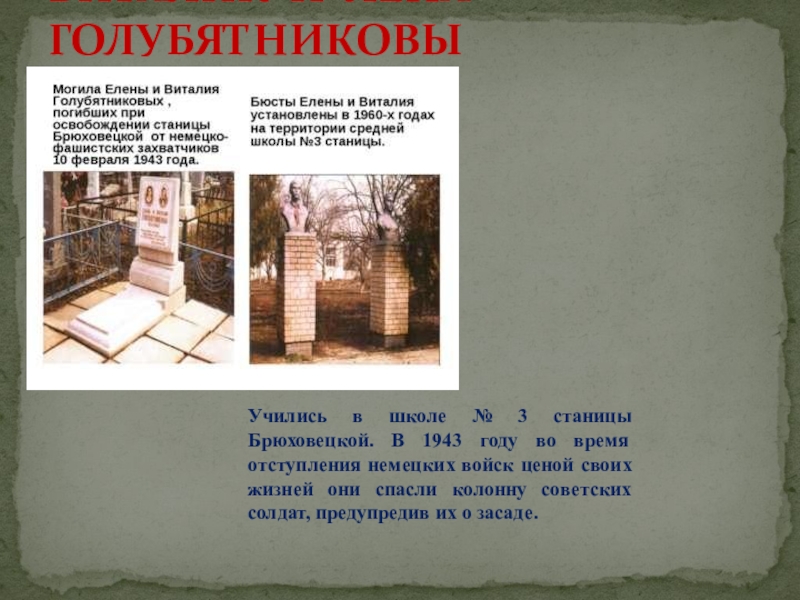 Учились в школе № 3 станицы Брюховецкой. В 1943 году во время отступления немецких войск ценой своих жизней они спасли колонну советских солдат, предупредив их о засаде.