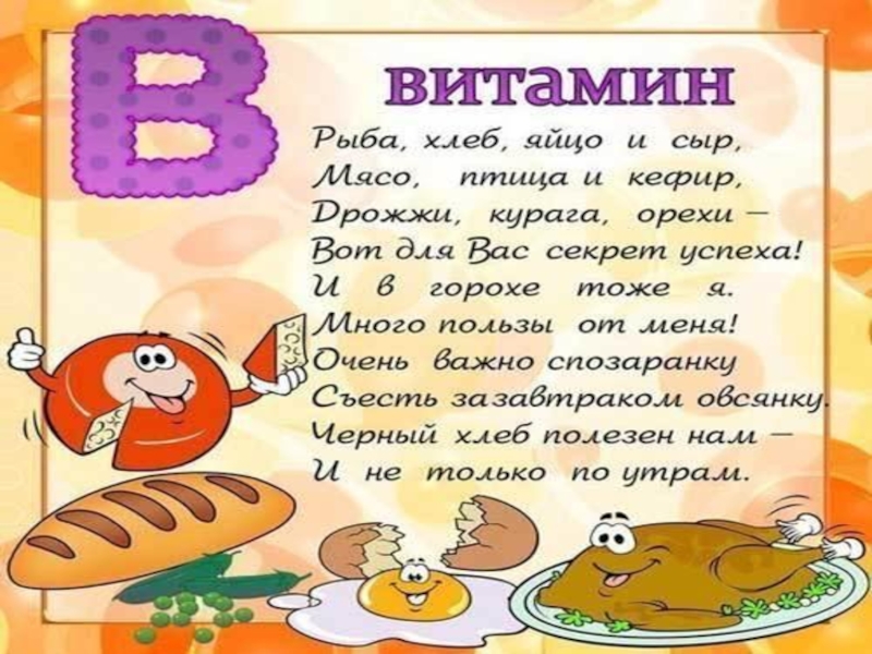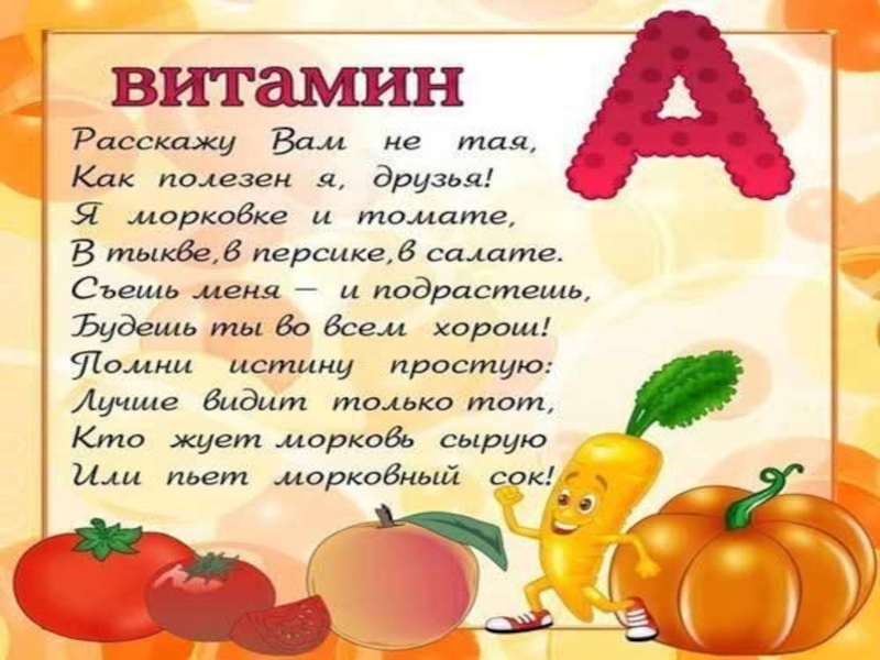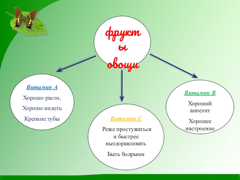 фруктыовощиВитамин АХорошо расти,Хорошо видетьКрепкие зубыВитамин СРеже простужаться и быстрее выздоравливатьБыть бодрымиВитамин ВХороший аппетитХорошее настроение