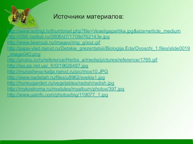 Источники материалов:http://www.reitingi.lv/thumbnail.php?file=Veseligapartika.jpg&size=article_mediumhttp://i056.radikal.ru/0806/d7/1709d762143e.jpghttp://www.bearcub.ru/images/img_g/xoz.gifhttp://papa-vlad.narod.ru/Detskie_prezentatsii/Biologija.Eda/Ovoschi_1.files/slide0019_image040.png  http://probio.io/ru/reference/Herbs_a/media/pictures/reference/1765.gifhttp://las.pp.net.ua/_fr/0/19626487.jpghttp://murasheva-katja.narod.ru/pic/mos10.JPGhttp://www.nadietah.ru/files/u8962/svekla1.jpghttp://honeygarden.ru/vegetables/radish/radish.jpghttp://mykostroma.ru/modules/myalbum/photos/397.jpghttp://www.uainfo.com/photos/big/119077_1.jpg