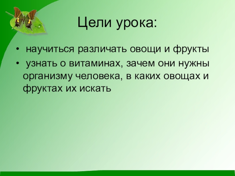 Цели урока: научиться различать овощи и фрукты узнать о витаминах, зачем они нужны организму человека, в каких