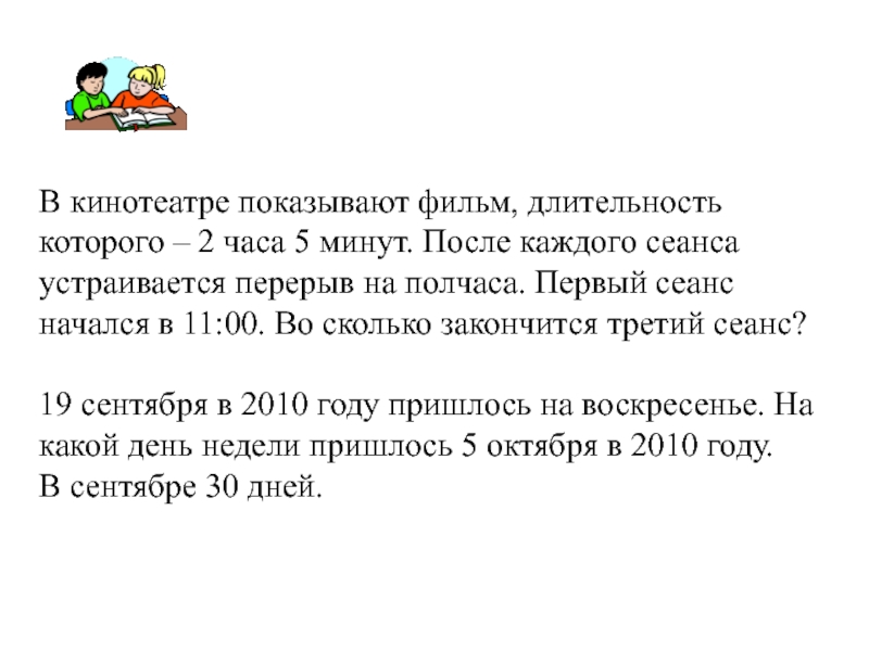После каждого сеанса устраивается перерыв на полчаса. Первый сеанс начался в 11:00. Во сколько закончится третий сеанс? 19 сентября в 2010 году пришлось на воскресенье. На какой день недели пришлось 5 октября в 2010 году. В сентябре 30 дней.