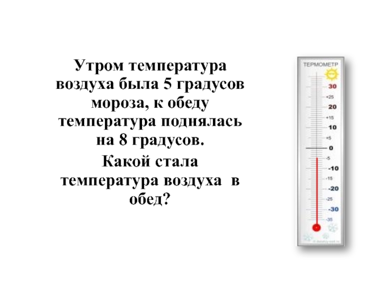 Утром температура воздуха была 5 градусов мороза, к обеду температура поднялась на 8 градусов. Какой стала температура