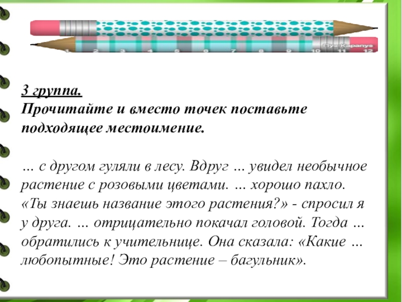 гуляли в лесу. Вдруг … увидел необычное растение с розовыми цветами. … хорошо пахло. «Ты знаешь название этого растения?» - спросил я у друга. … отрицательно покачал головой. Тогда … обратились к учительнице. Она сказала: «Какие … любопытные! Это растение – багульник».