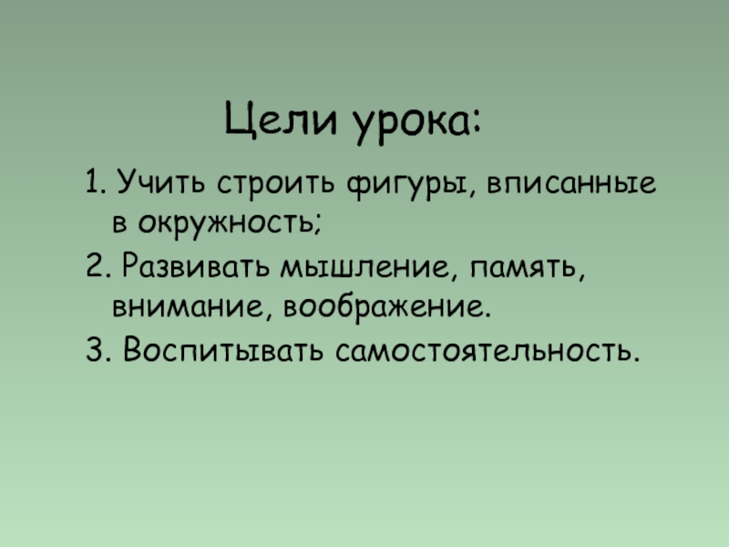 Цели урока:1. Учить строить фигуры, вписанные в окружность;2. Развивать мышление, память, внимание, воображение.3. Воспитывать самостоятельность.
