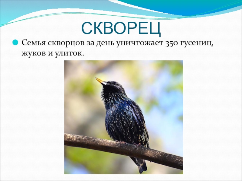 СКВОРЕЦСемья скворцов за день уничтожает 350 гусениц, жуков и улиток.