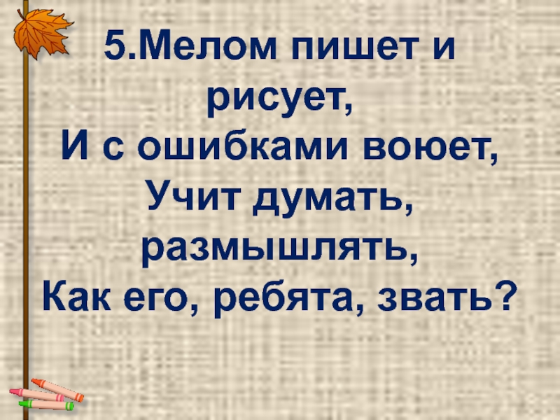 5.Мелом пишет и рисует, И с ошибками воюет, Учит думать, размышлять, Как его, ребята, звать?