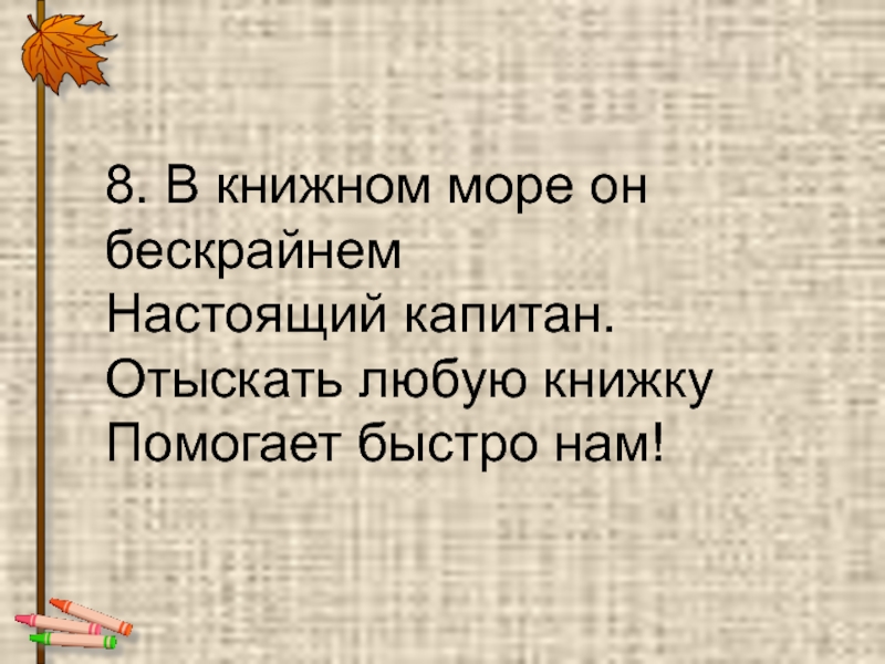8. В книжном море он бескрайнем Настоящий капитан. Отыскать любую книжку Помогает быстро нам!