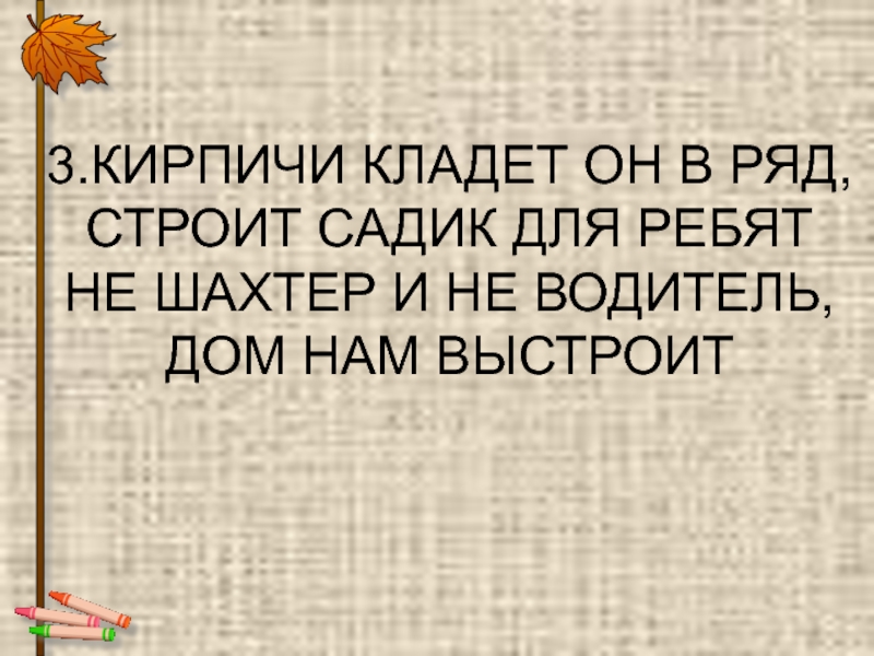 3.КИРПИЧИ КЛАДЕТ ОН В РЯД,СТРОИТ САДИК ДЛЯ РЕБЯТНЕ ШАХТЕР И НЕ ВОДИТЕЛЬ,ДОМ НАМ ВЫСТРОИТ