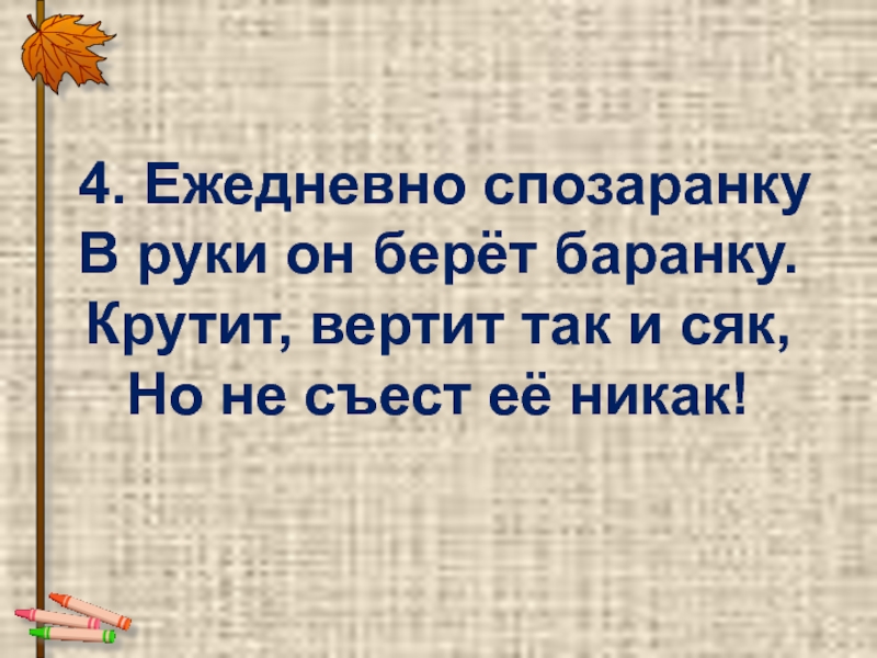 4. Ежедневно спозаранку В руки он берёт баранку. Крутит, вертит так и сяк, Но