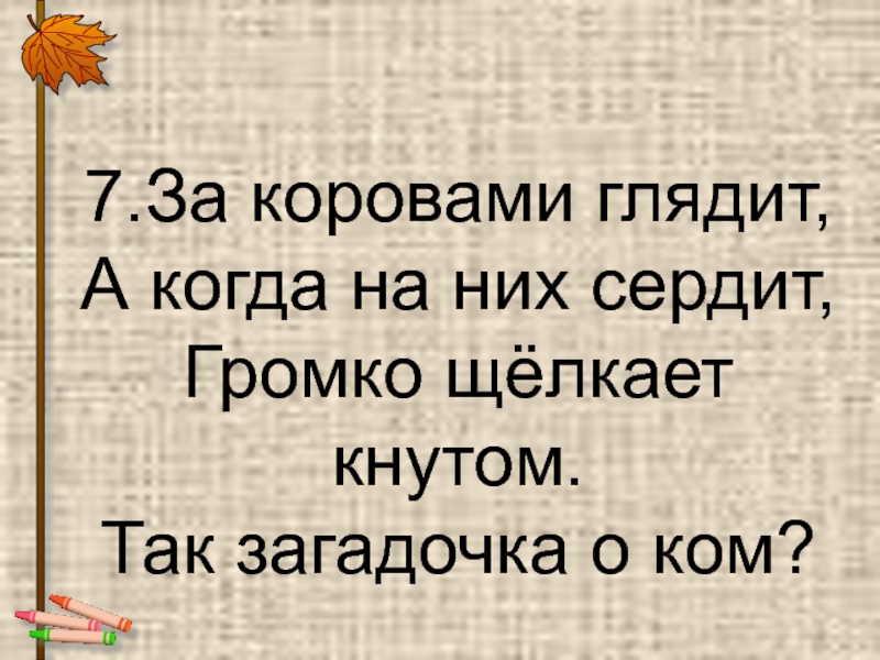 7.За коровами глядит, А когда на них сердит, Громко щёлкает кнутом. Так загадочка о