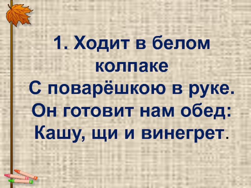 1. Ходит в белом колпаке С поварёшкою в руке. Он готовит нам обед: Кашу, щи и винегрет.