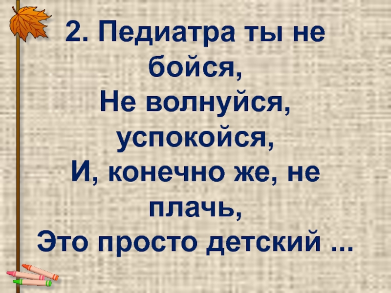 2. Педиатра ты не бойся, Не волнуйся, успокойся, И, конечно же, не плачь, Это просто детский ...