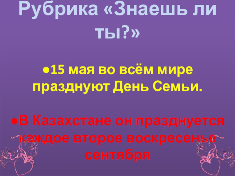 Рубрика «Знаешь ли ты?»  ●15 мая во всём мире празднуют День Семьи.   ●В Казахстане