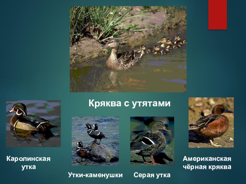 Кряква с утятамиСерая уткаАмериканская чёрная крякваКаролинская     уткаУтки-каменушки