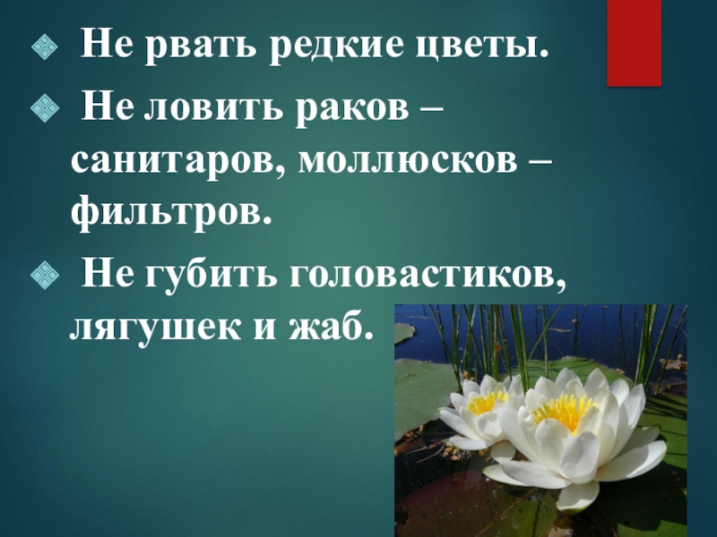 Не рвать редкие цветы. Не ловить раков – санитаров, моллюсков – фильтров. Не губить головастиков, лягушек