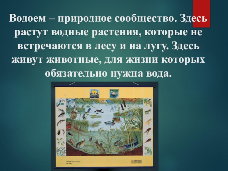 Водоем – природное сообщество. Здесь растут водные растения, которые не встречаются в лесу и на лугу. Здесь живут животные, для жизни которых обязательно нужна вода.