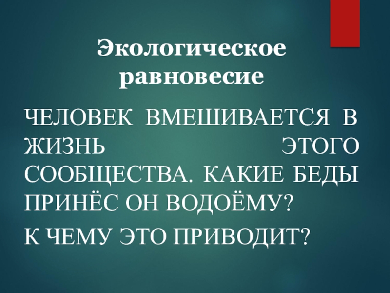 Экологическое равновесиеЧЕЛОВЕК ВМЕШИВАЕТСЯ В ЖИЗНЬ ЭТОГО СООБЩЕСТВА. КАКИЕ БЕДЫ ПРИНЁС ОН ВОДОЁМУ? К ЧЕМУ ЭТО ПРИВОДИТ?
