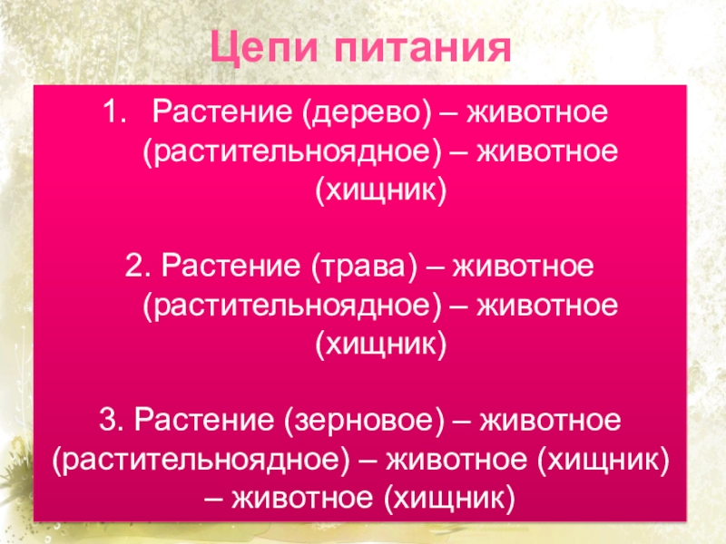 3. Растение (зерновое) – животное (растительноядное) – животное (хищник) – животное (хищник)