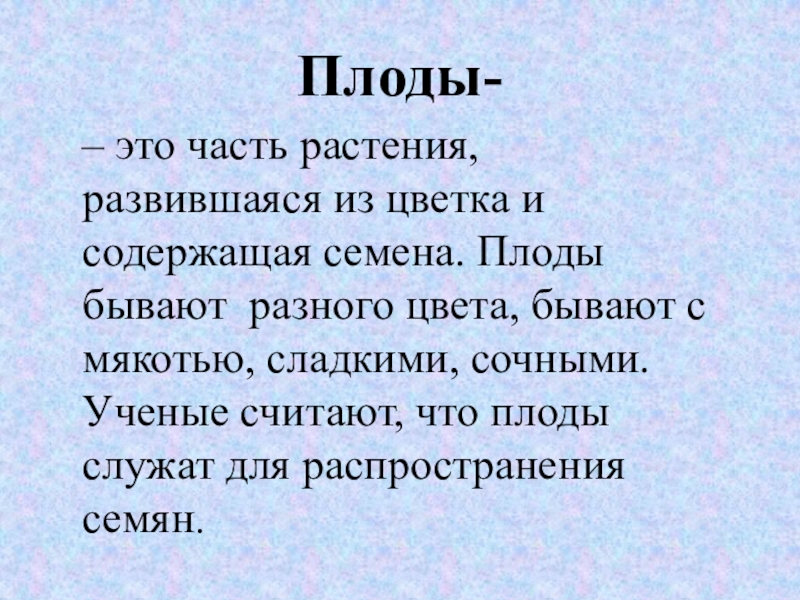 Плоды-– это часть растения, развившаяся из цветка и содержащая семена. Плоды бывают разного цвета, бывают с мякотью,