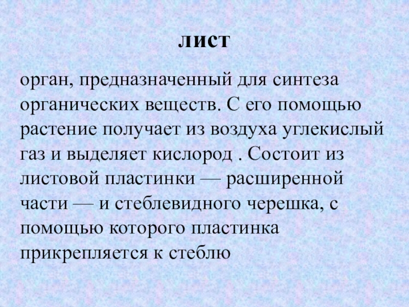 листорган, предназначенный для синтеза органических веществ. С его помощью растение получает из воздуха углекислый газ и выделяет