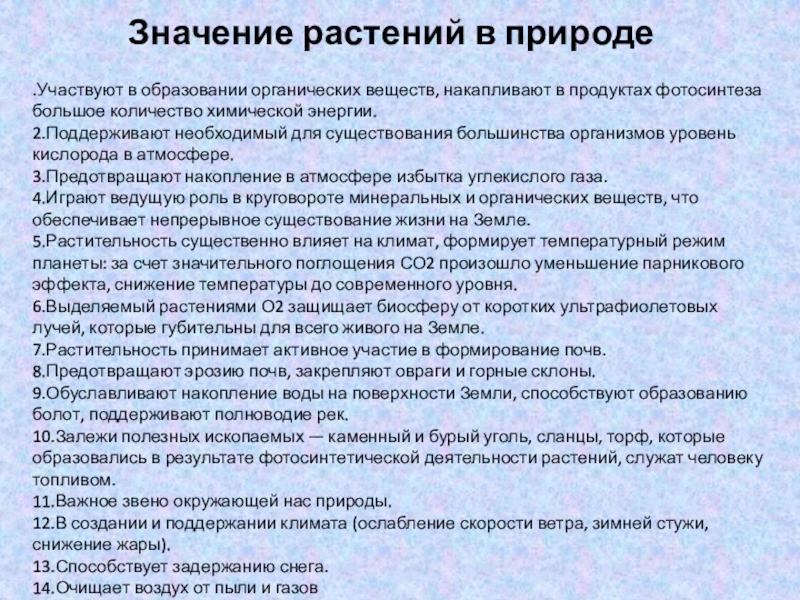 фотосинтеза большое количество химической энергии. 2.Поддерживают необходимый для существования большинства организмов уровень кислорода в атмосфере. 3.Предотвращают накопление в атмосфере избытка углекислого газа. 4.Играют ведущую роль в круговороте минеральных и органических веществ, что обеспечивает непрерывное существование жизни на Земле. 5.Растительность существенно влияет на климат, формирует температурный режим планеты: за счет значительного поглощения СО2 произошло уменьшение парникового эффекта, снижение температуры до современного уровня. 6.Выделяемый растениями О2 защищает биосферу от коротких ультрафиолетовых лучей, которые губительны для всего живого на Земле. 7.Растительность принимает активное участие в формирование почв. 8.Предотвращают эрозию почв, закрепляют овраги и горные склоны. 9.Обуславливают накопление воды на поверхности Земли, способствуют образованию болот, поддерживают полноводие рек. 10.Залежи полезных ископаемых — каменный и бурый уголь, сланцы, торф, которые образовались в результате фотосинтетической деятельности растений, служат человеку топливом. 11.Важное звено окружающей нас природы. 12.В создании и поддержании климата (ослабление скорости ветра, зимней стужи, снижение жары). 13.Способствует задержанию снега. 14.Очищает воздух от пыли и газов