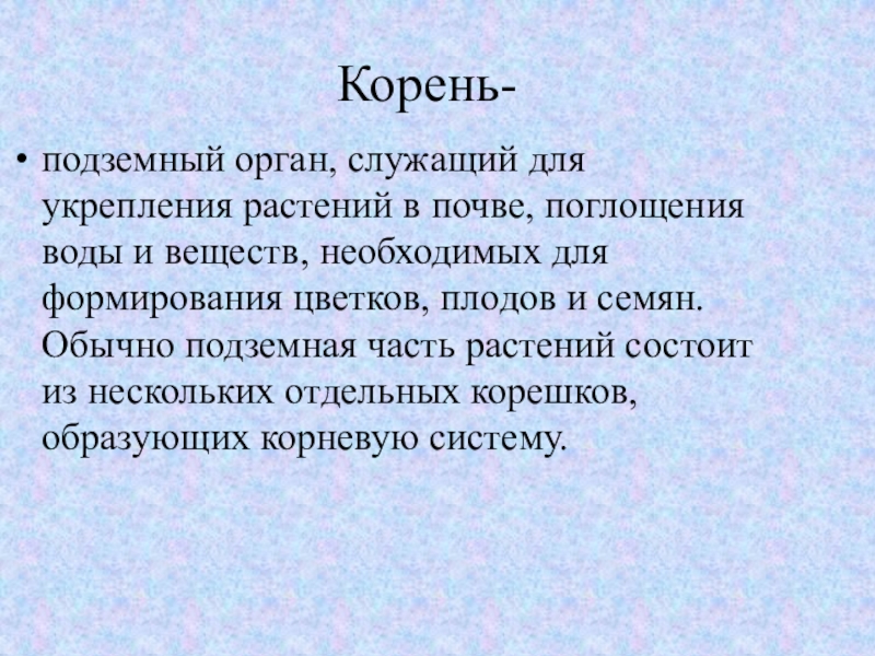 Корень-подземный орган, служащий для укрепления растений в почве, поглощения воды и веществ, необходимых для формирования цветков, плодов