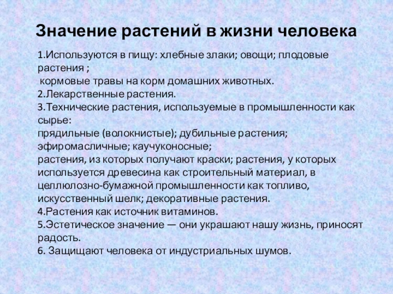 растения ; кормовые травы на корм домашних животных. 2.Лекарственные растения. 3.Технические растения, используемые в промышленности как сырье: прядильные (волокнистые); дубильные растения; эфиромасличные; каучуконосные; растения, из которых получают краски; растения, у которых используется древесина как строительный материал, в целлюлозно-бумажной промышленности как топливо, искусственный шелк; декоративные растения. 4.Растения как источник витаминов. 5.Эстетическое значение — они украшают нашу жизнь, приносят радость. 6. Защищают человека от индустриальных шумов.
