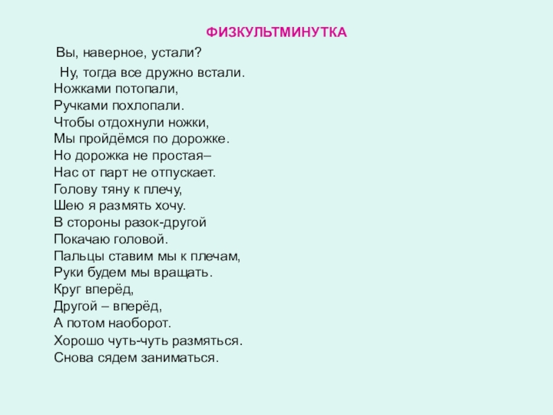 тогда все дружно встали. Ножками потопали, Ручками похлопали. Чтобы отдохнули ножки, Мы пройдёмся по дорожке. Но дорожка не простая– Нас от парт не отпускает. Голову тяну к плечу, Шею я размять хочу. В стороны разок-другой Покачаю головой. Пальцы ставим мы к плечам, Руки будем мы вращать. Круг вперёд, Другой – вперёд, А потом наоборот. Хорошо чуть-чуть размяться. Снова сядем заниматься.