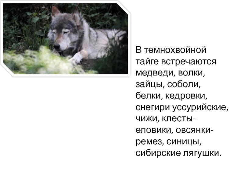 В темнохвойной тайге встречаются медведи, волки, зайцы,