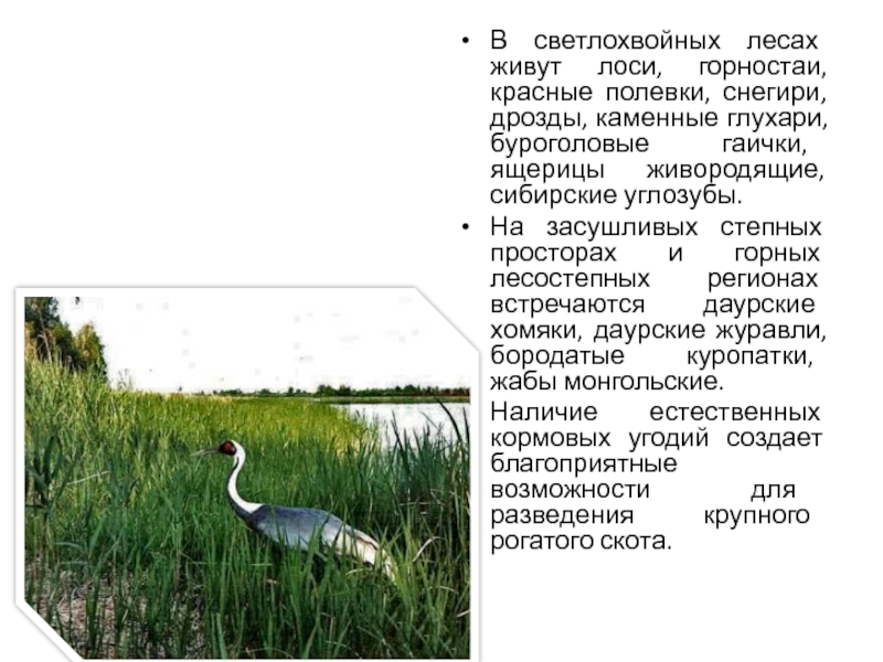 В светлохвойных лесах живут лоси, горностаи, красные полевки, снегири, дрозды,