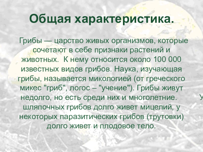 Общая характеристика.  Грибы — царство живых организмов, которые сочетают в себе признаки растений и животных.  К нему относится около 100 000 известных видов грибов. Наука, изучающая грибы, называется микологией (от греческого микес "гриб", логос – "учение"). Грибы живут недолго, но есть
