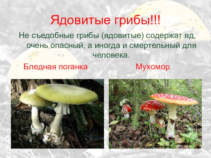 Ядовитые грибы!!!Не съедобные грибы (ядовитые) содержат яд, очень опасный, а иногда и смертельный для человека.  Бледная