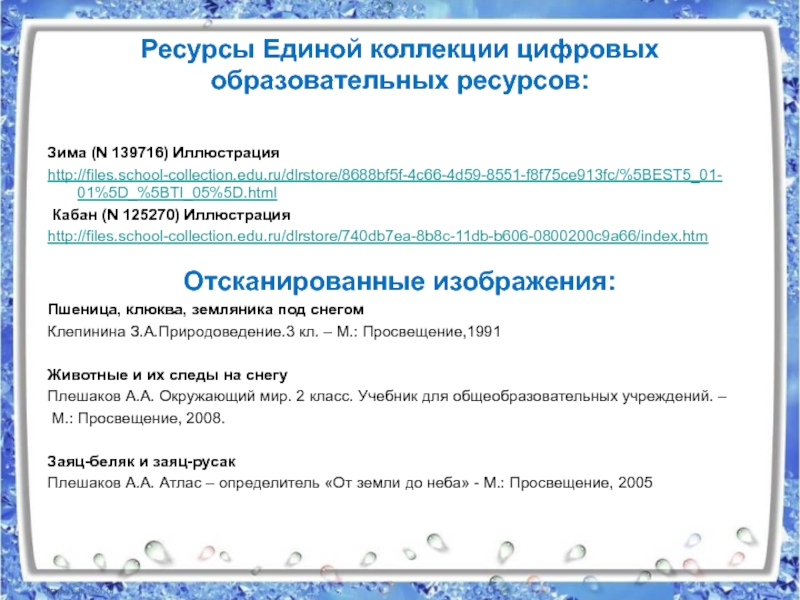 Ресурсы Единой коллекции цифровых образовательных ресурсов:  Зима (N 139716) Иллюстрация http://files.school-collection.edu.ru/dlrstore/8688bf5f-4c66-4d59-8551-f8f75ce913fc/%5BEST5_01-   01%5D_%5BTI_05%5D.html Кабан (N 125270)