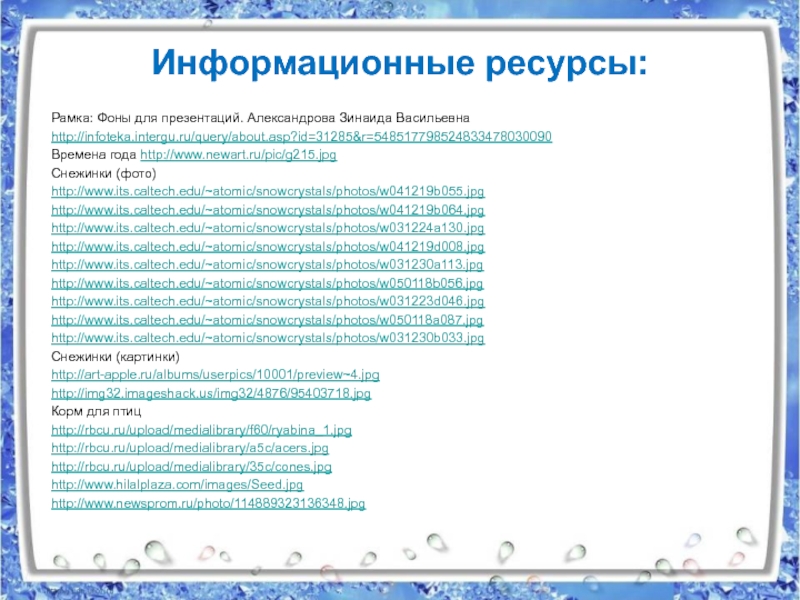 Информационные ресурсы:Рамка: Фоны для презентаций. Александрова Зинаида Васильевнаhttp://infoteka.intergu.ru/query/about.asp?id=31285&r=548517798524833478030090Времена года http://www.newart.ru/pic/g215.jpgСнежинки (фото)http://www.its.caltech.edu/~atomic/snowcrystals/photos/w041219b055.jpghttp://www.its.caltech.edu/~atomic/snowcrystals/photos/w041219b064.jpghttp://www.its.caltech.edu/~atomic/snowcrystals/photos/w031224a130.jpghttp://www.its.caltech.edu/~atomic/snowcrystals/photos/w041219d008.jpghttp://www.its.caltech.edu/~atomic/snowcrystals/photos/w031230a113.jpghttp://www.its.caltech.edu/~atomic/snowcrystals/photos/w050118b056.jpghttp://www.its.caltech.edu/~atomic/snowcrystals/photos/w031223d046.jpghttp://www.its.caltech.edu/~atomic/snowcrystals/photos/w050118a087.jpghttp://www.its.caltech.edu/~atomic/snowcrystals/photos/w031230b033.jpgСнежинки (картинки)http://art-apple.ru/albums/userpics/10001/preview~4.jpghttp://img32.imageshack.us/img32/4876/95403718.jpgКорм для птицhttp://rbcu.ru/upload/medialibrary/f60/ryabina_1.jpghttp://rbcu.ru/upload/medialibrary/a5c/acers.jpghttp://rbcu.ru/upload/medialibrary/35c/cones.jpghttp://www.hilalplaza.com/images/Seed.jpghttp://www.newsprom.ru/photo/114889323136348.jpg