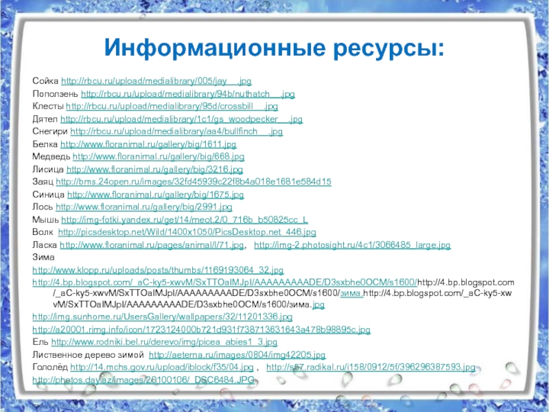 Информационные ресурсы:Сойка http://rbcu.ru/upload/medialibrary/005/jay__.jpgПоползень http://rbcu.ru/upload/medialibrary/94b/nuthatch__.jpgКлесты http://rbcu.ru/upload/medialibrary/95d/crossbill__.jpg Дятел http://rbcu.ru/upload/medialibrary/1c1/gs_woodpecker__.jpgСнегири http://rbcu.ru/upload/medialibrary/aa4/bullfinch__.jpgБелка http://www.floranimal.ru/gallery/big/1611.jpgМедведь http://www.floranimal.ru/gallery/big/668.jpgЛисица http://www.floranimal.ru/gallery/big/3216.jpgЗаяц http://bms.24open.ru/images/32fd45939c22f8b4a018e1681e584d15Синица http://www.floranimal.ru/gallery/big/1675.jpgЛось http://www.floranimal.ru/gallery/big/2991.jpgМышь http://img-fotki.yandex.ru/get/14/meot.2/0_716b_b50825cc_LВолк http://picsdesktop.net/Wild/1400x1050/PicsDesktop.net_446.jpgЛаска http://www.floranimal.ru/pages/animal/l/71.jpg,