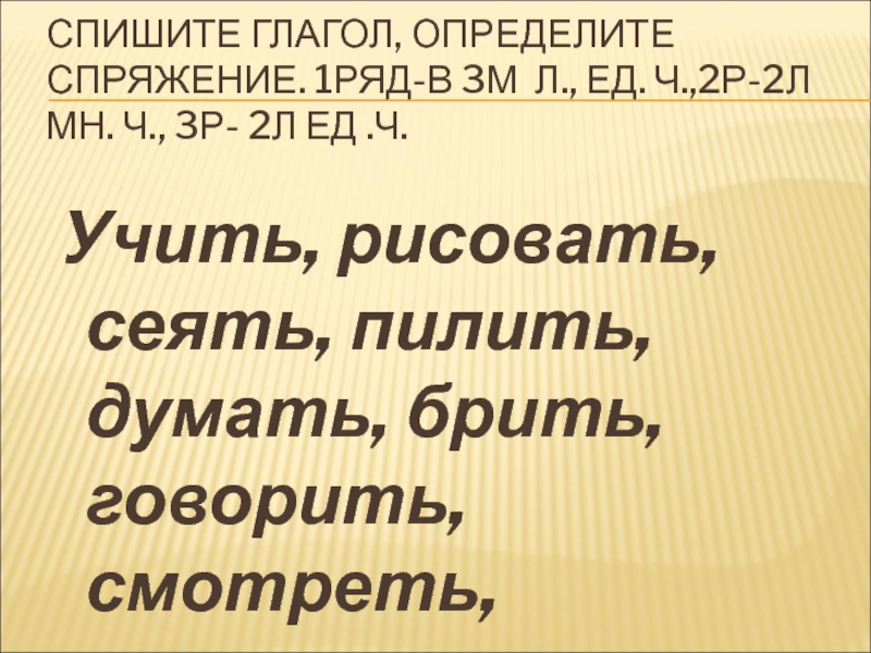 Учить, рисовать, сеять, пилить, думать, брить, говорить, смотреть, просить, гасить.