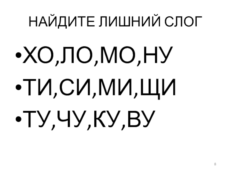 Слайд 8НАЙДИТЕ ЛИШНИЙ СЛОГ