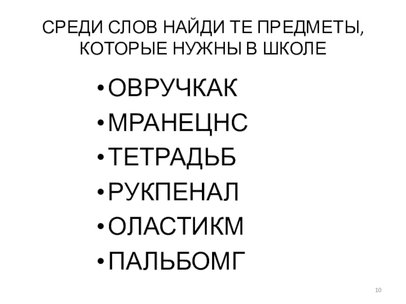 Слайд 10СРЕДИ СЛОВ НАЙДИ ТЕ ПРЕДМЕТЫ,КОТОРЫЕ НУЖНЫ В ШКОЛЕ