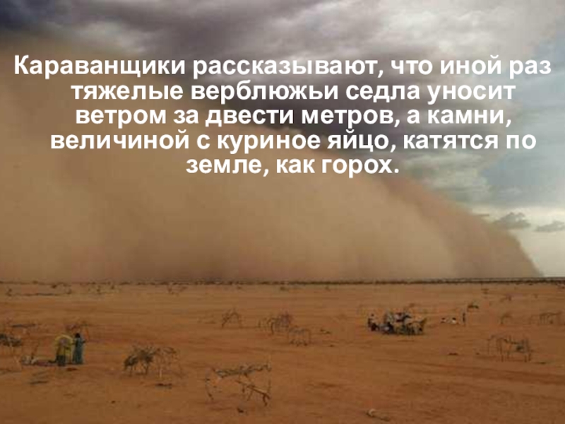 Слайд 13Караванщики рассказывают, что иной раз тяжелые верблюжьи седла уносит ветром за