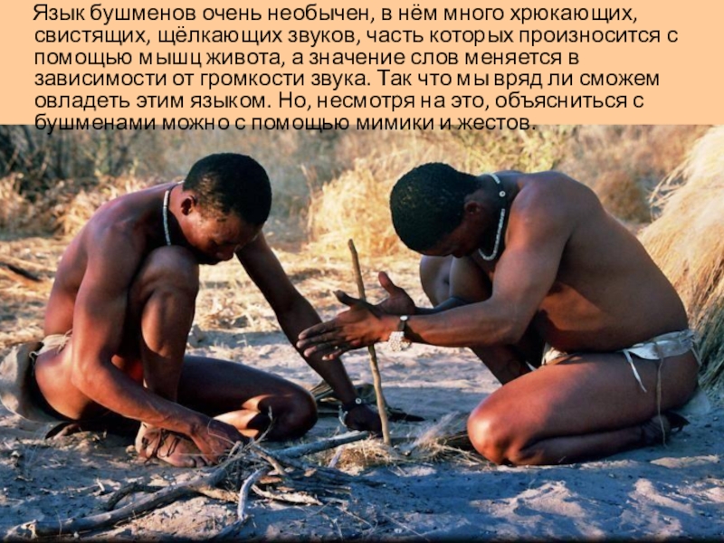 свистящих, щёлкающих звуков, часть которых произносится с помощью мышц живота, а значение слов меняется в зависимости от громкости звука. Так что мы вряд ли сможем овладеть этим языком. Но, несмотря на это, объясниться с бушменами можно с помощью мимики и жестов.
