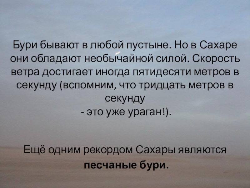 пустыне. Но в Сахаре они обладают необычайной силой. Скорость ветра достигает иногда пятидесяти метров в секунду (вспомним, что тридцать метров в секунду
