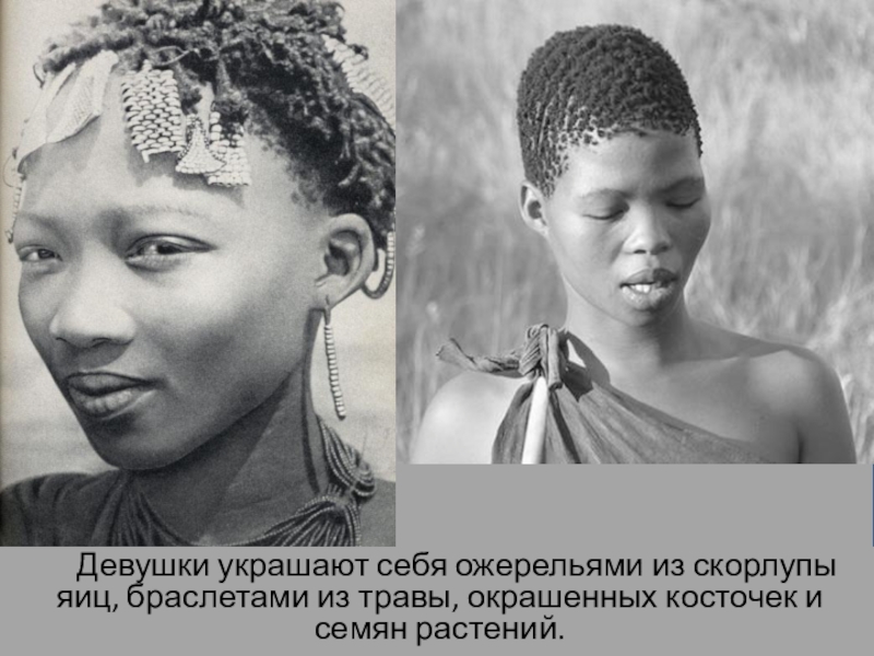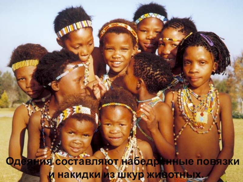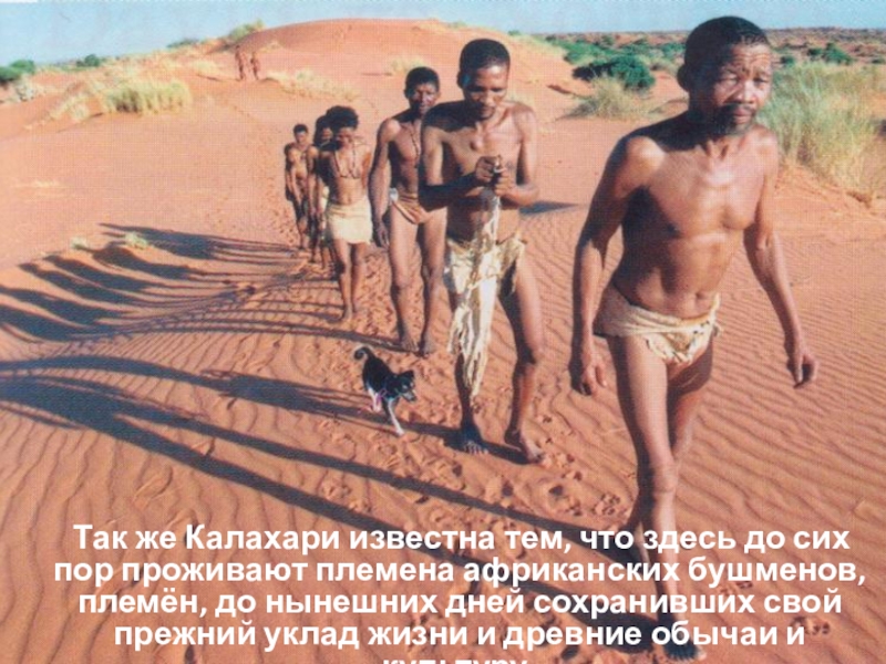 сих пор проживают племена африканских бушменов, племён, до нынешних дней сохранивших свой прежний уклад жизни и древние обычаи и культуру.