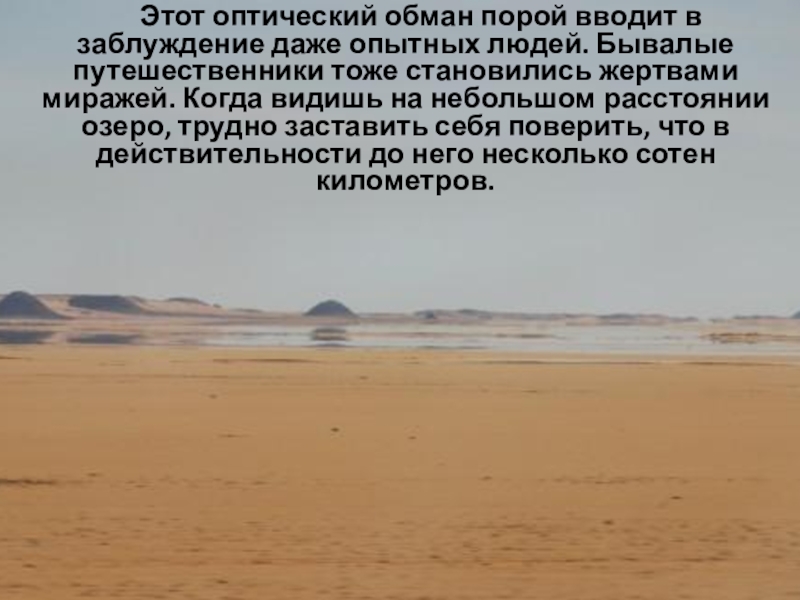 в заблуждение даже опытных людей. Бывалые путешественники тоже становились жертвами миражей. Когда видишь на небольшом расстоянии озеро, трудно заставить себя поверить, что в действительности до него несколько сотен километров.