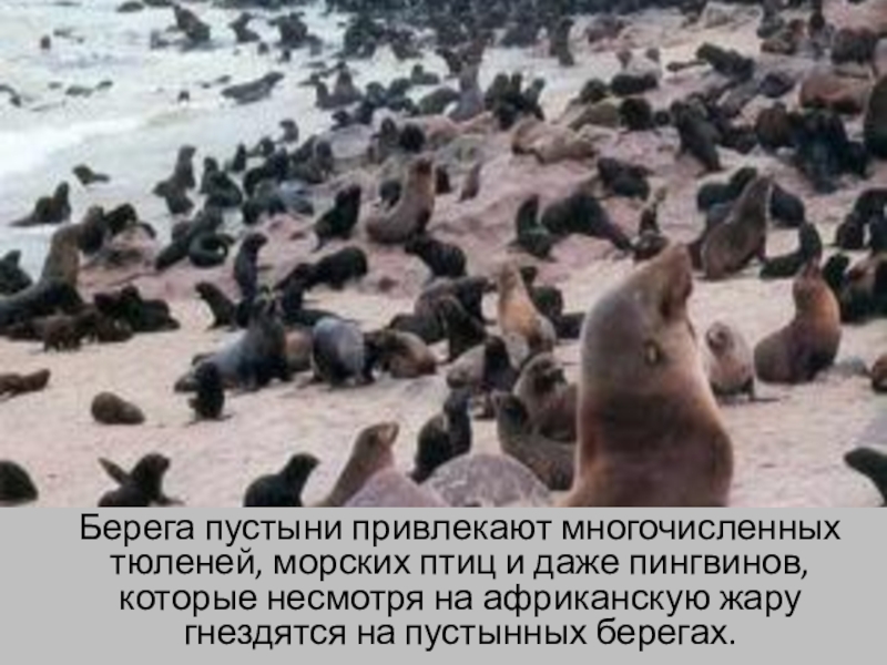 Слайд 55 Берега пустыни привлекают многочисленных тюленей, морских птиц и даже