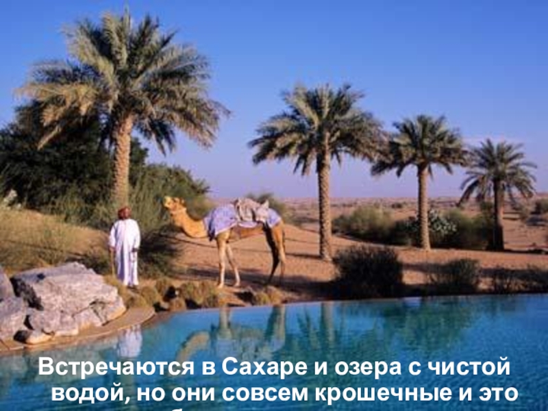 Слайд 20Встречаются в Сахаре и озера с чистой водой, но они совсем