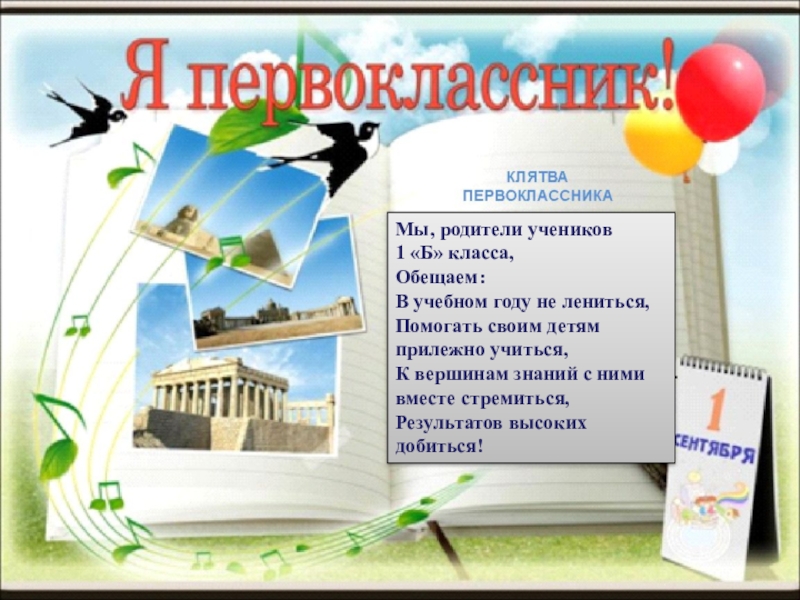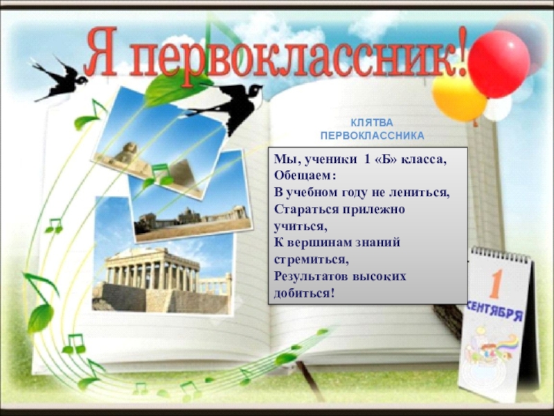 Мы, ученики 1 «Б» класса, Обещаем:В учебном году не лениться,Стараться прилежно учиться,К вершинам знаний стремиться,Результатов высоких добиться!