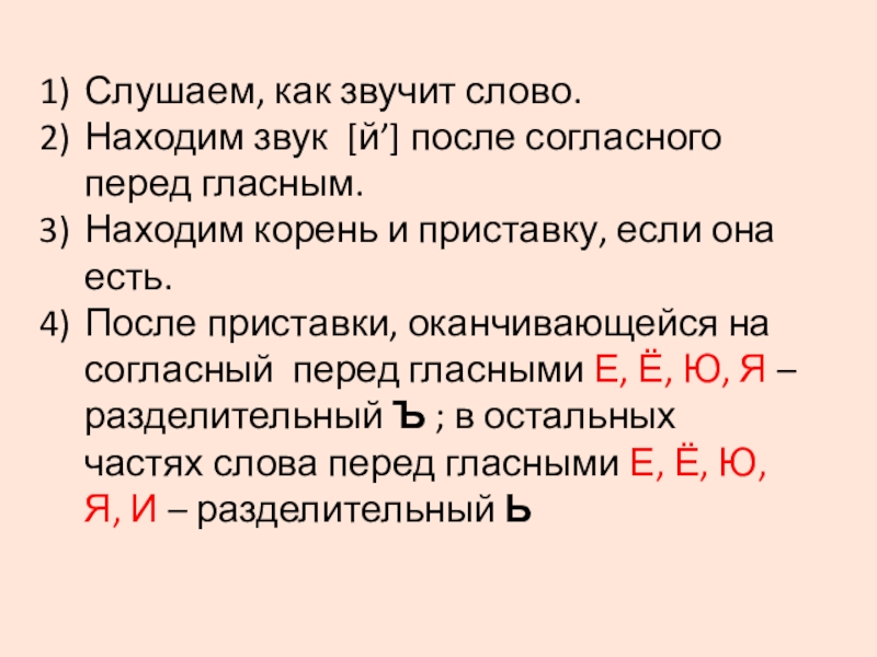 После приставки, оканчивающейся на согласный перед гласными Е, Ё, Ю, Я – разделительный Ъ ; в остальных частях слова перед гласными Е, Ё, Ю, Я, И – разделительный Ь