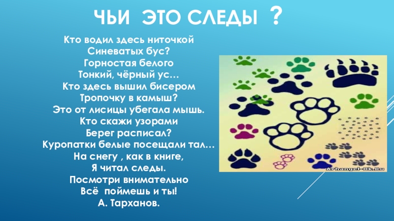 ЧЬИ ЭТО СЛЕДЫ ?Кто водил здесь ниточкойСиневатых бус?Горностая белогоТонкий, чёрный ус…Кто здесь вышил бисеромТропочку в камыш?Это от