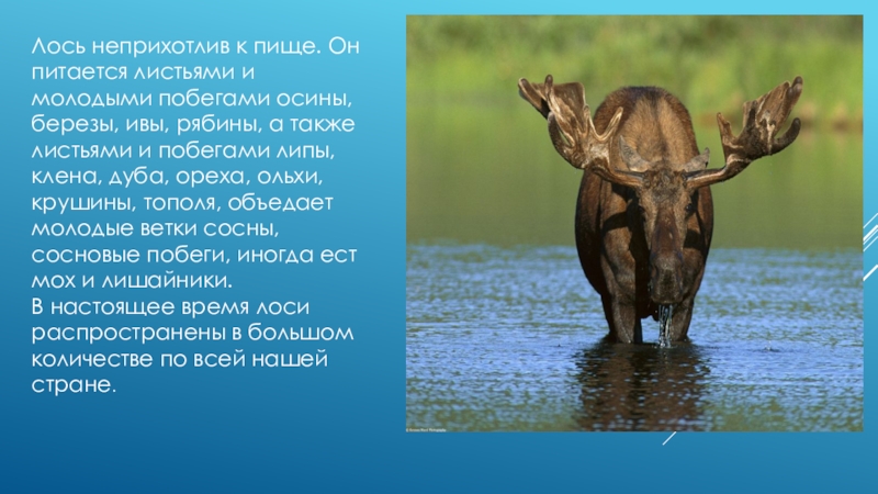 Слайд 8Лось неприхотлив к пище. Он питается листьями и молодыми побегами осины,