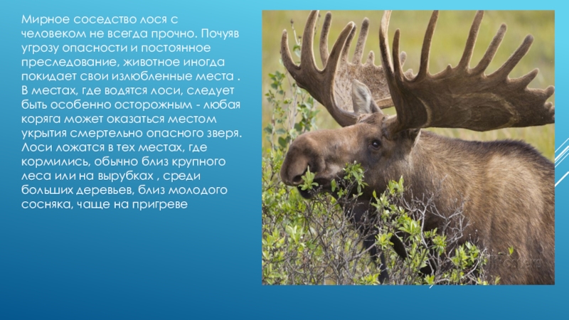 Слайд 7Мирное соседство лося с человеком не всегда прочно. Почуяв угрозу опасности